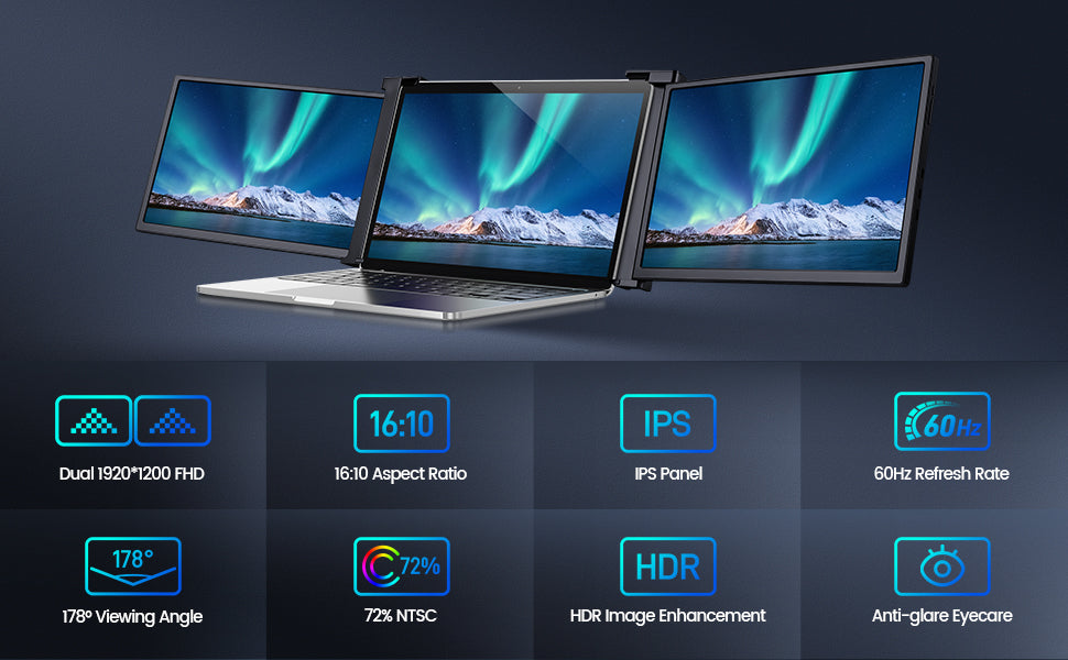 Immerse yourself in the captivating visual experience offered by the two 1920*1200P Full HD IPS panels featured in this product. Boasting a remarkable 72% NTSC HDR rating and a wide 178° viewing angle, these screens deliver exceptional clarity and color richness. Whether you're programming, graphic designing, editing documents, or analyzing stocks, the 16:10 aspect ratio screens provide the perfect canvas for your tasks.